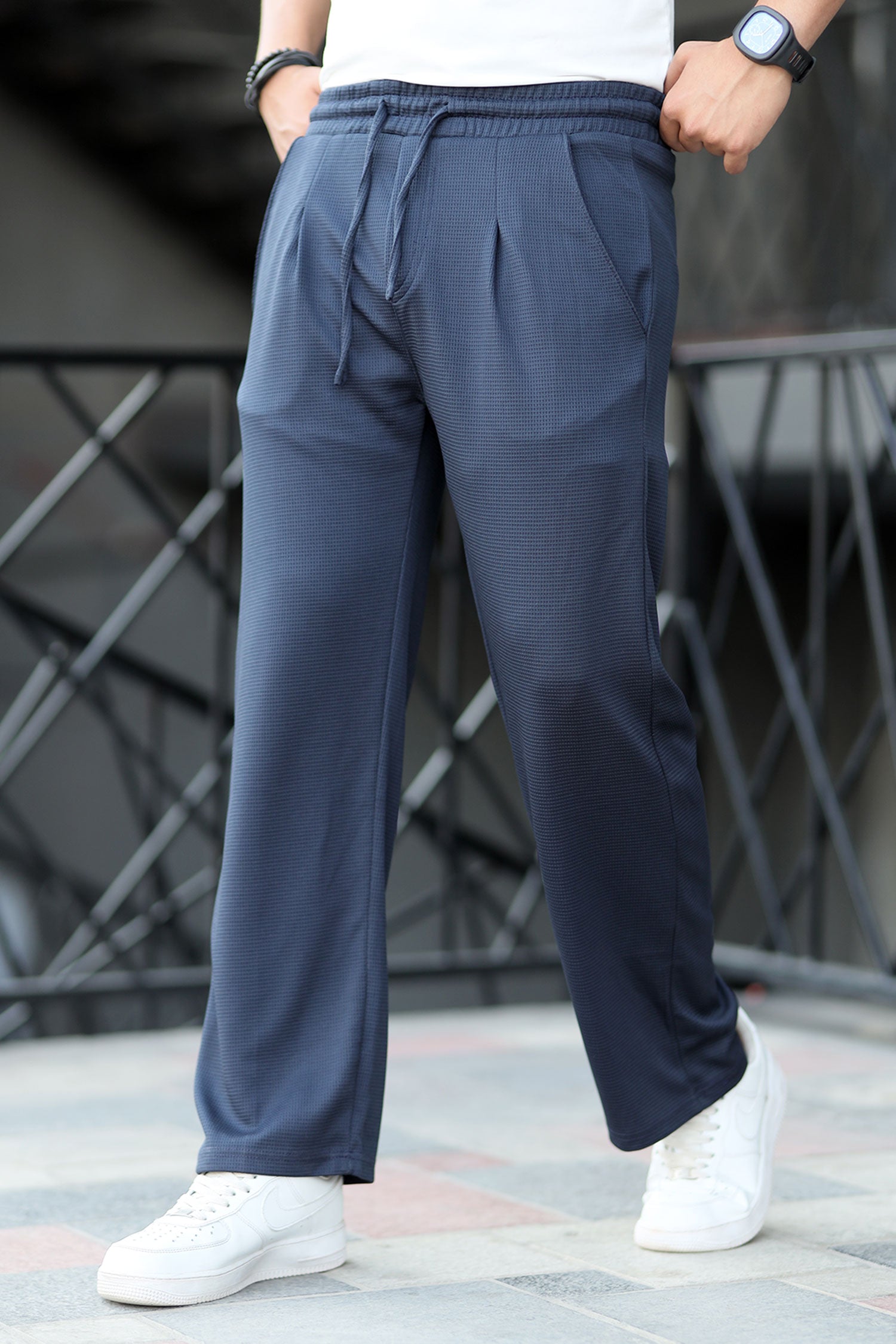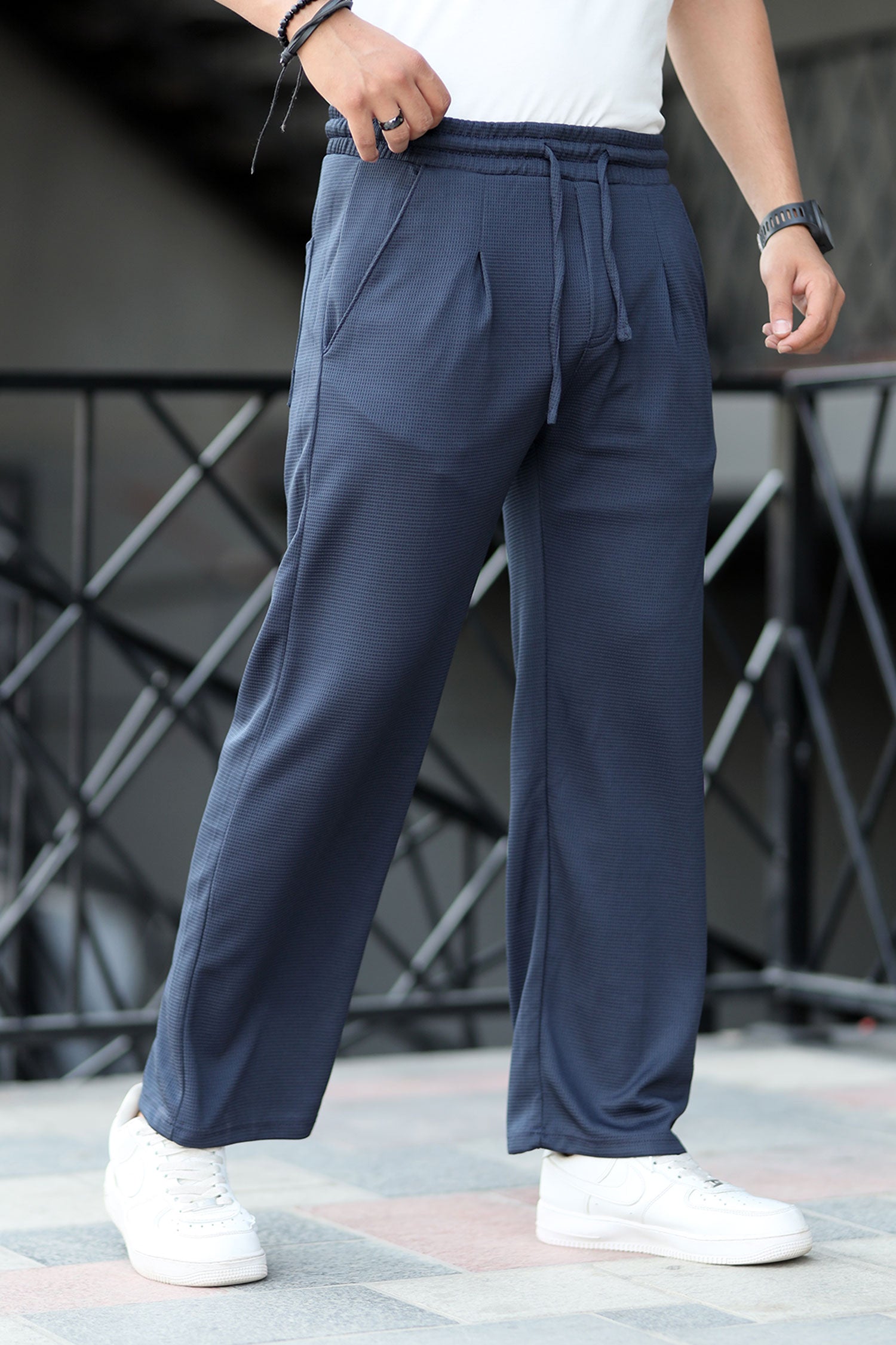 Turbo High Rise Pleated Waffle Pattern Loose Bottom Trouser In Navy Blue