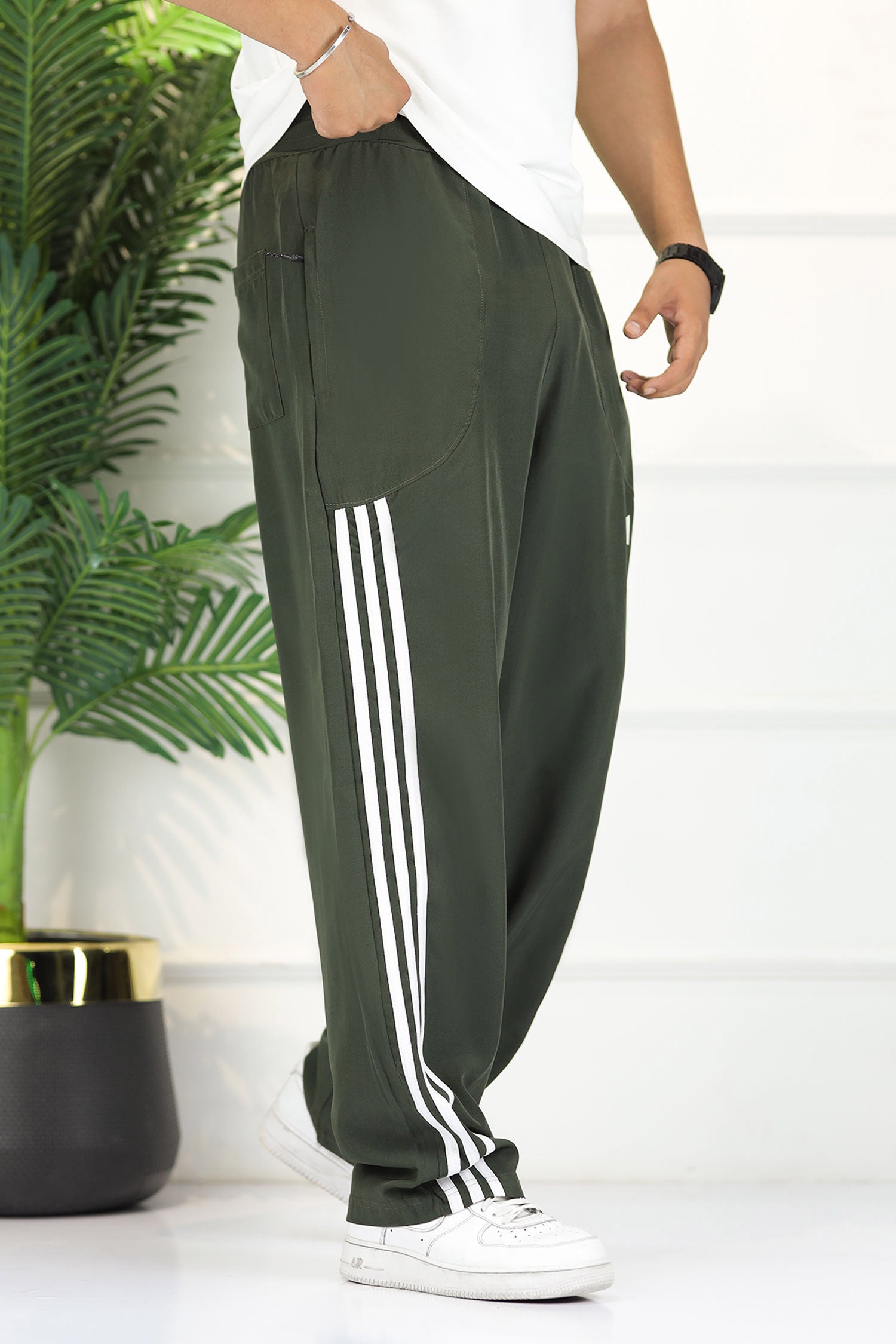 Plain Stripe Line Loose Bottom Trouser In Olive