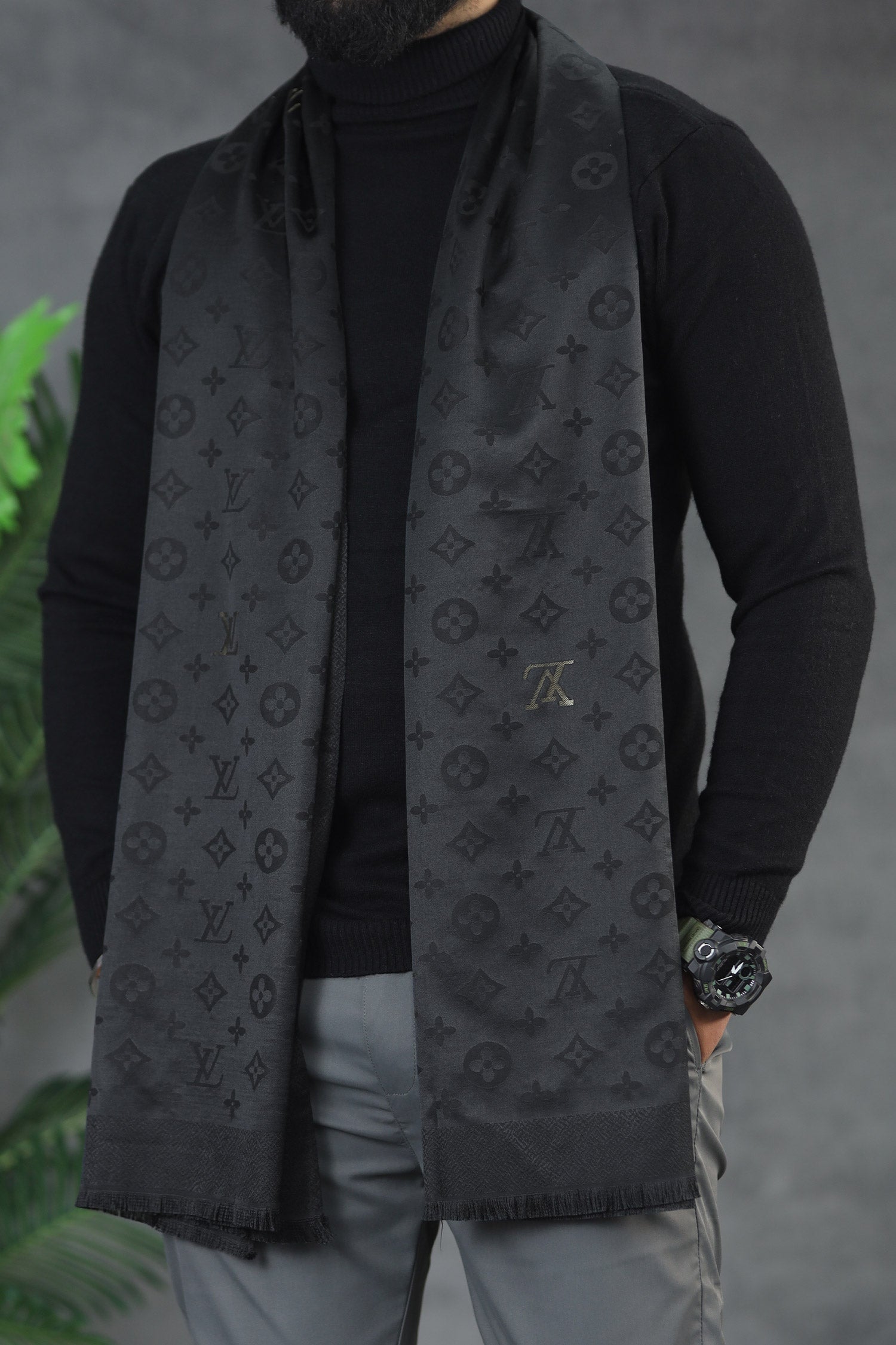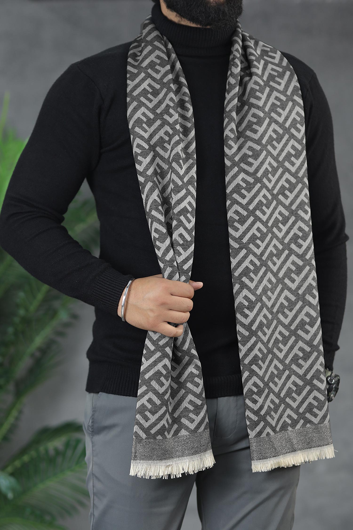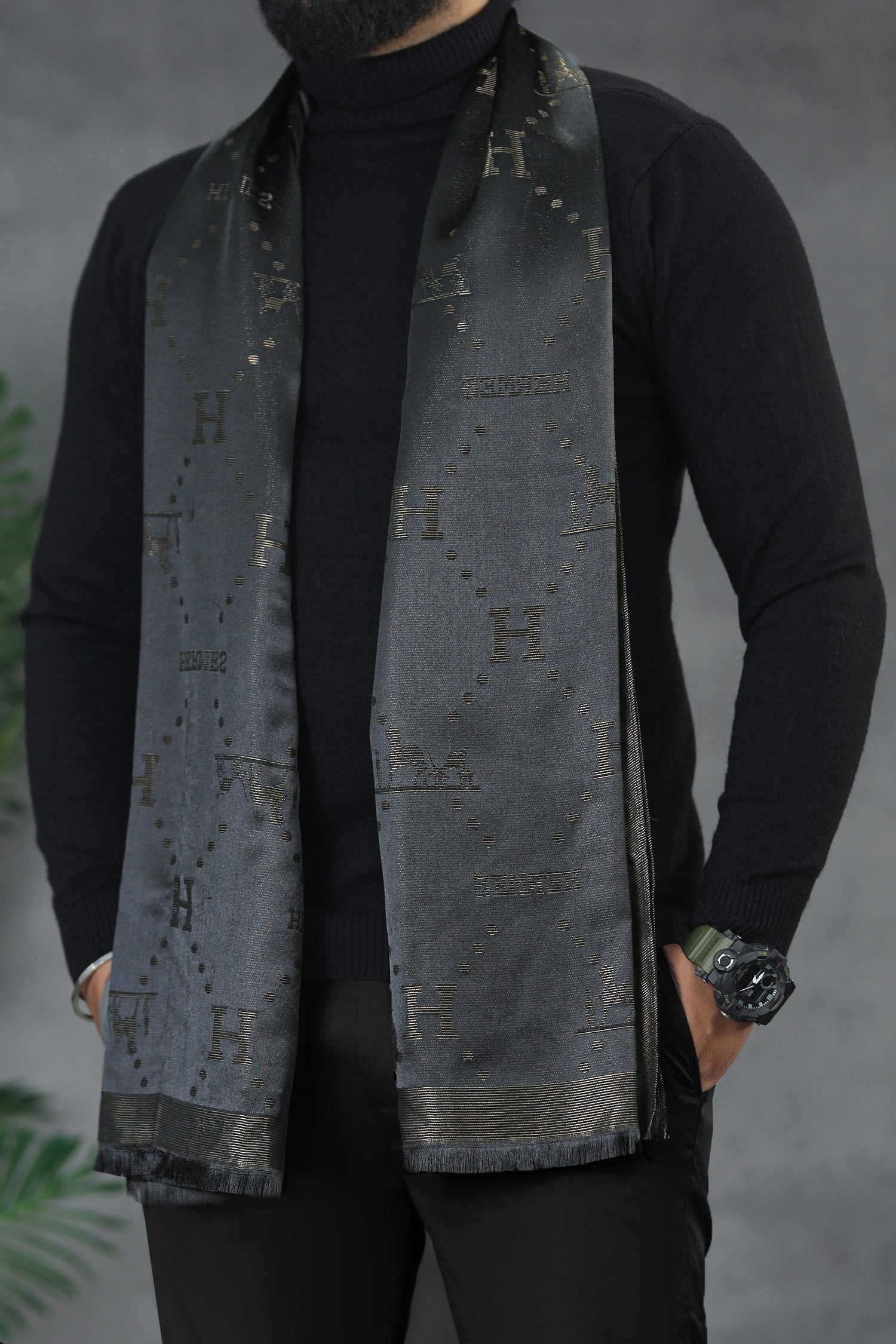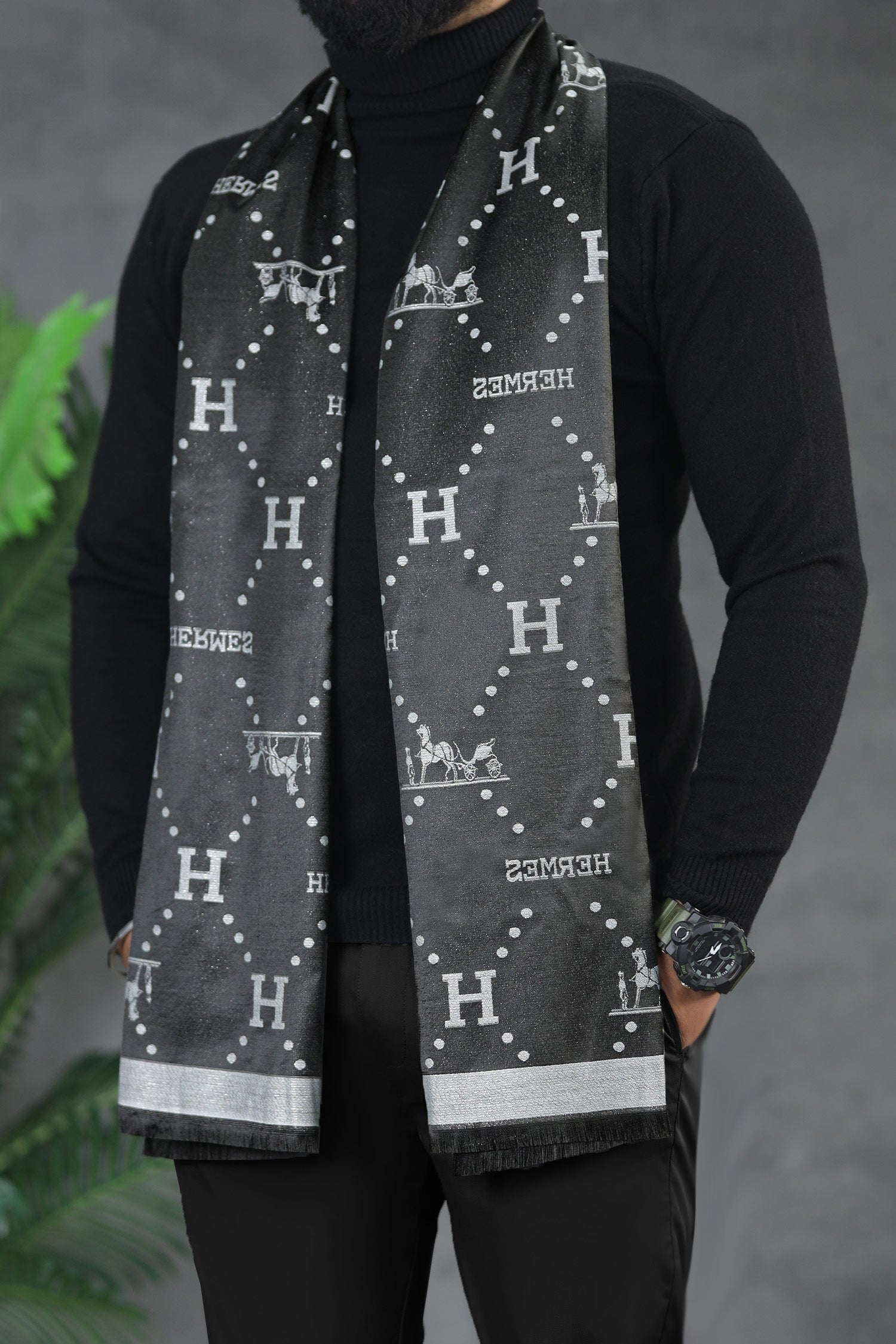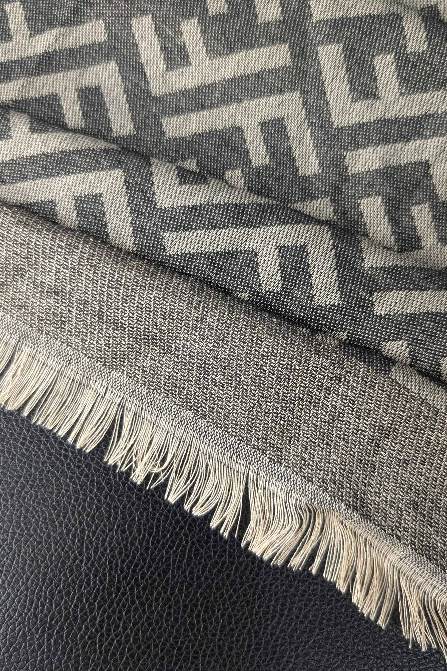 Hrms Beyond Monogram Silk Unisex Scarf In Black & Grey