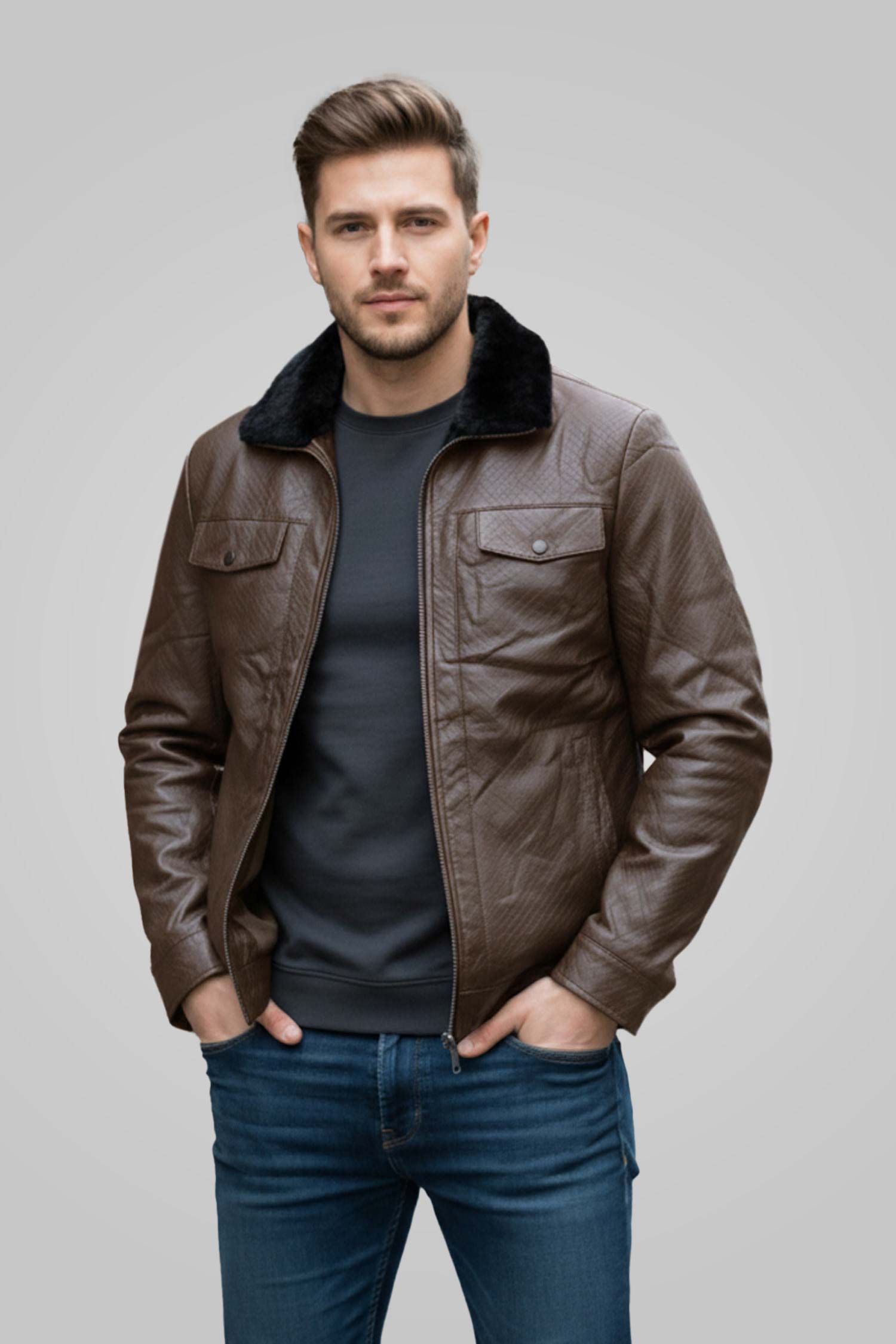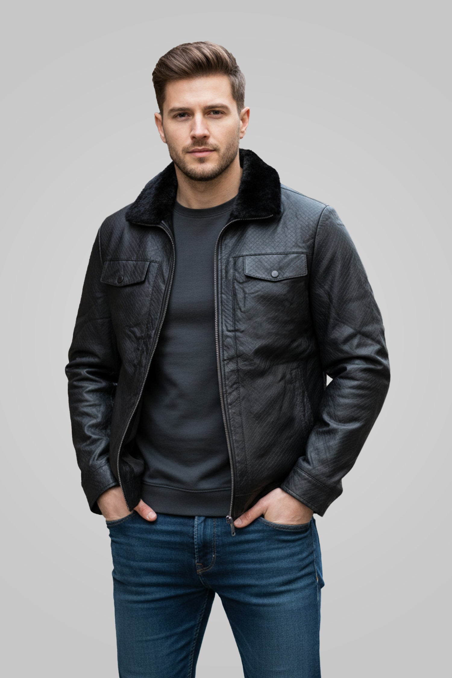Men's Solid Fur Collar PU Leather Jacket