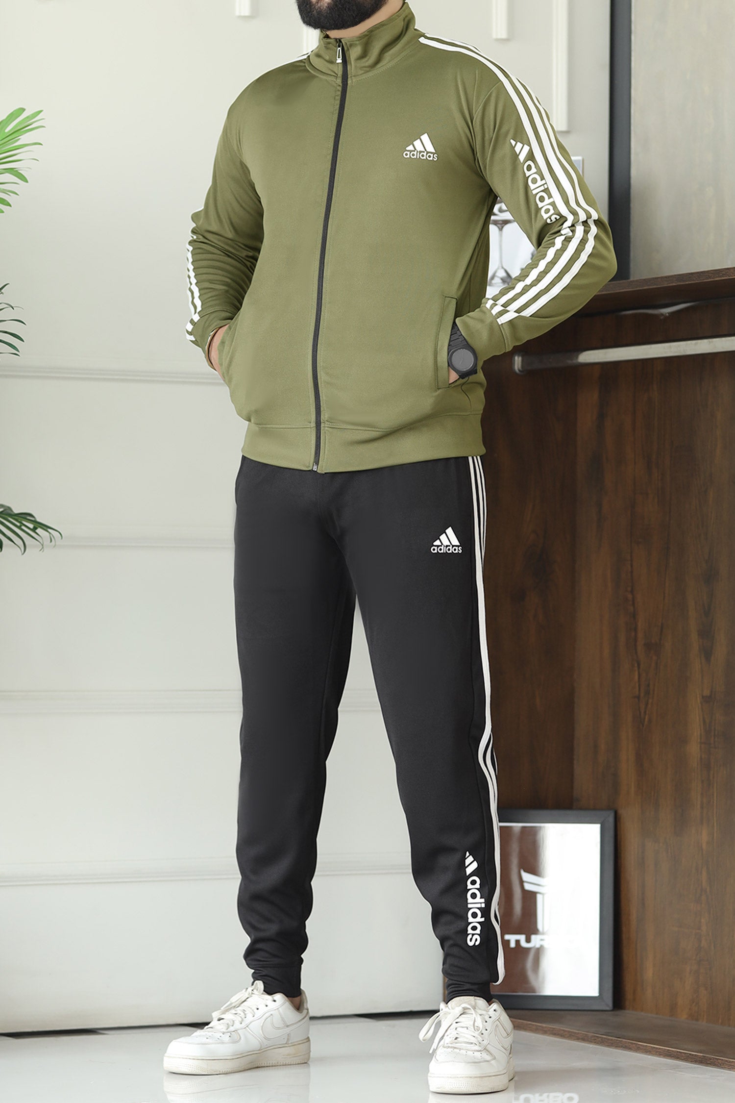 Adds 3 Stripes Signature Mock Neck Zipper Tracksuit In Mid Green & Black