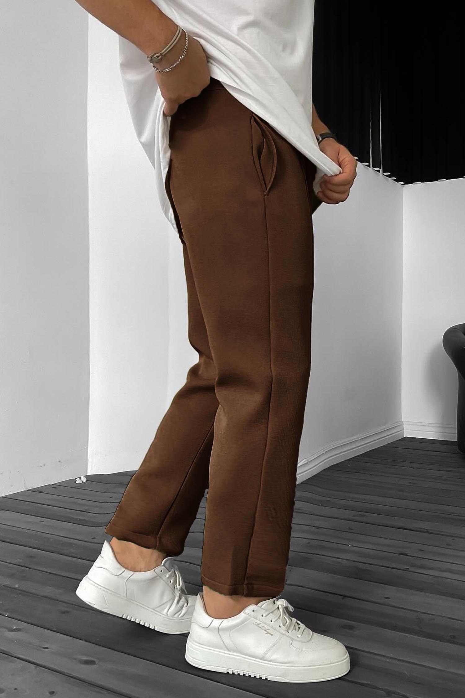 Plain Stripe Line Loose Bottom Trouser In Camel