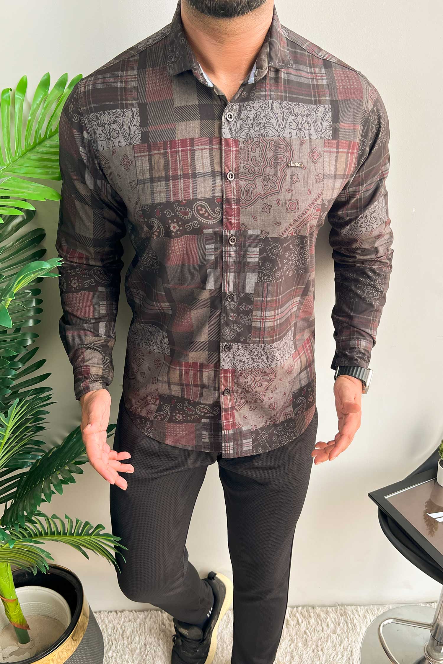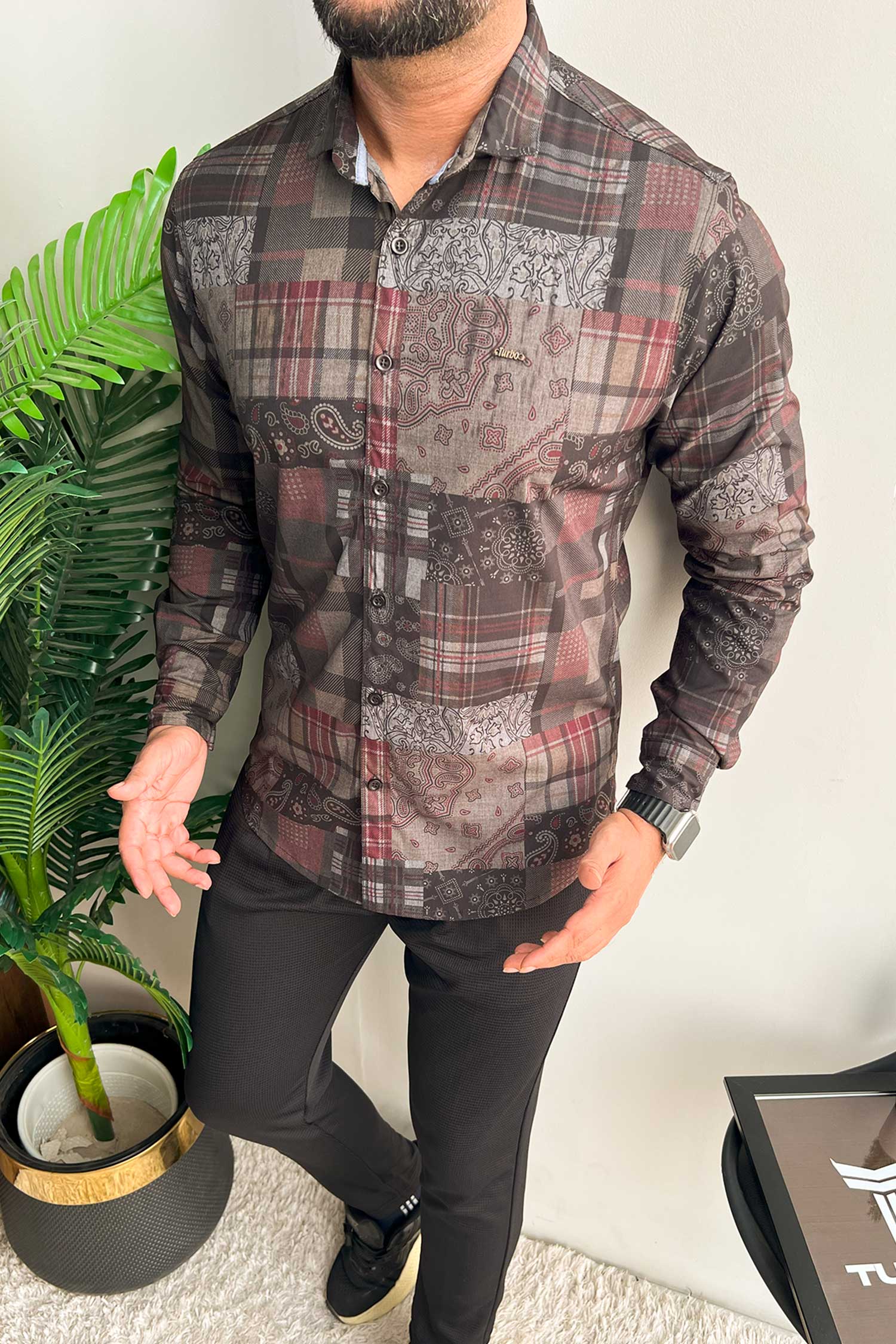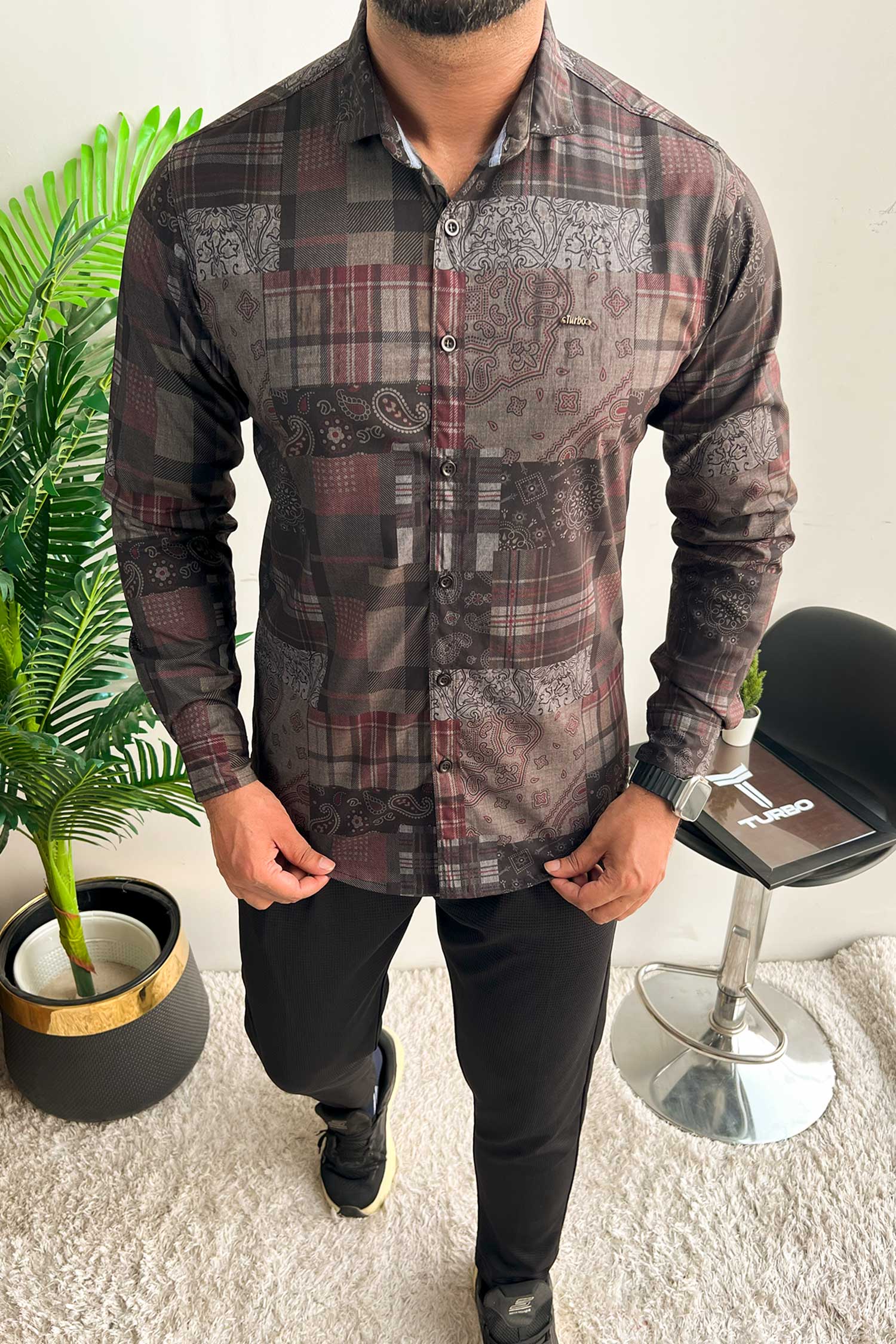 Turbo Checkered Crown Long Sleeve Cotton Casual Shirt In Charcoal Black