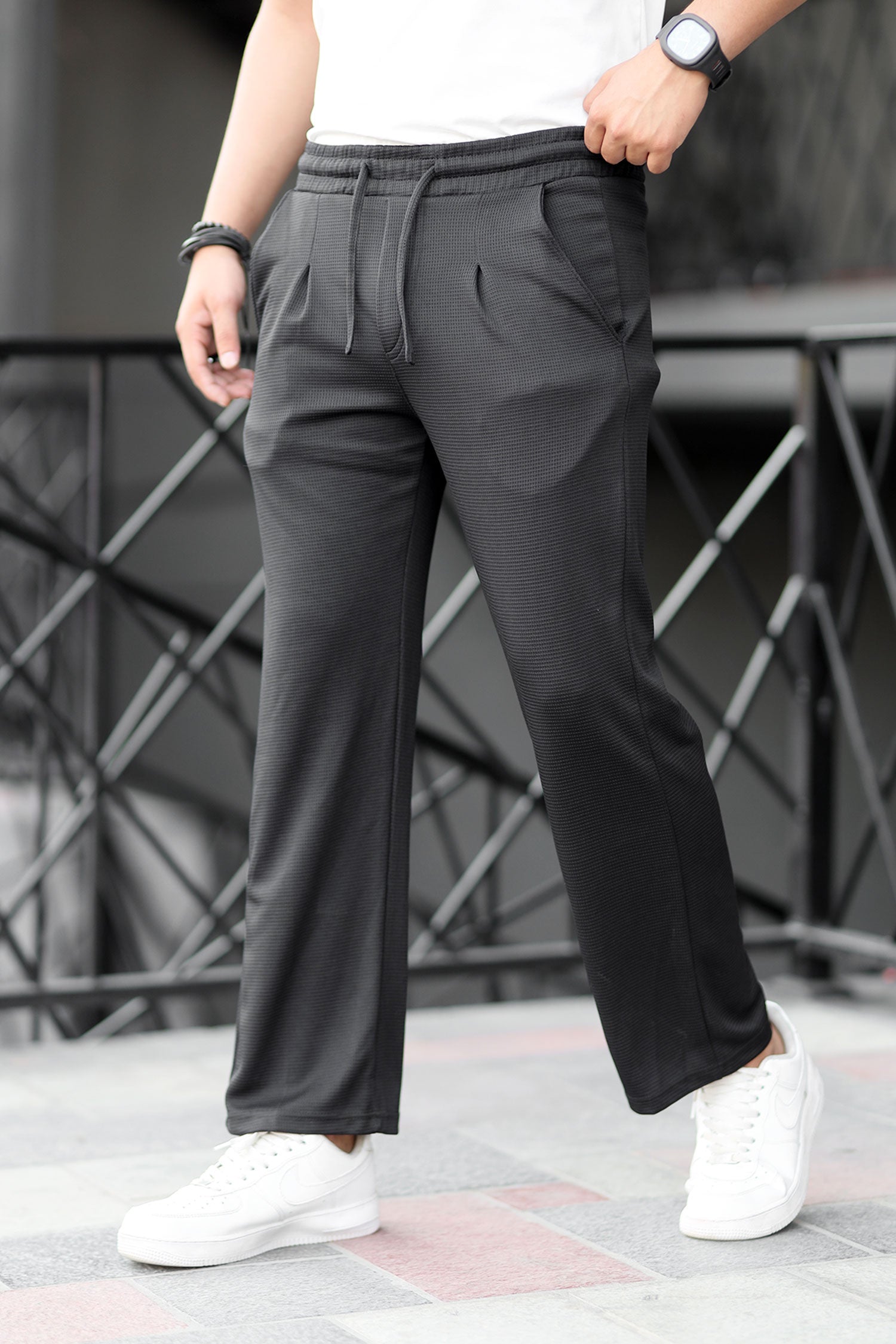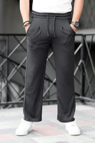 Turbo High Rise Pleated Waffle Pattern Loose Bottom Trouser In Black
