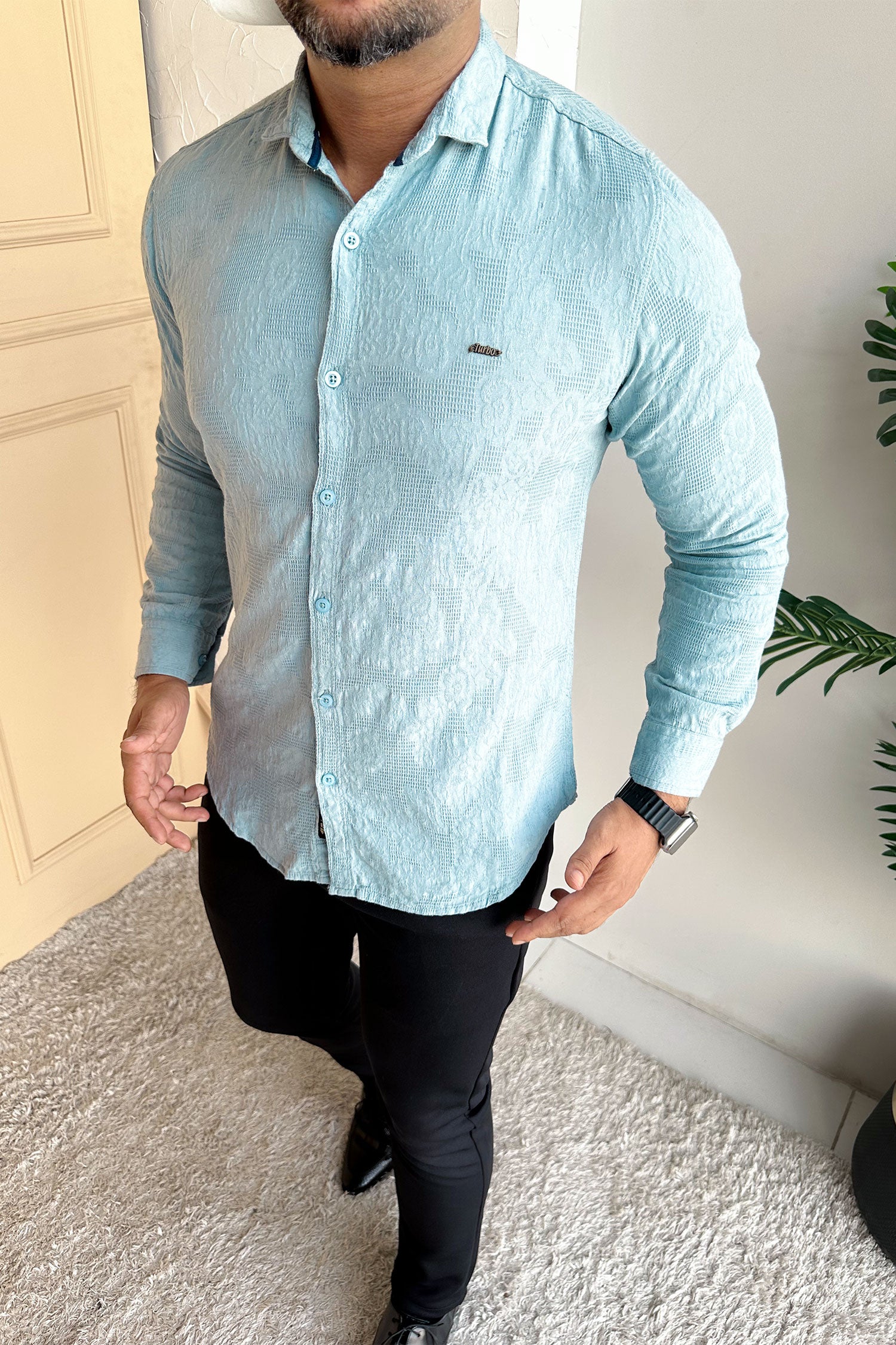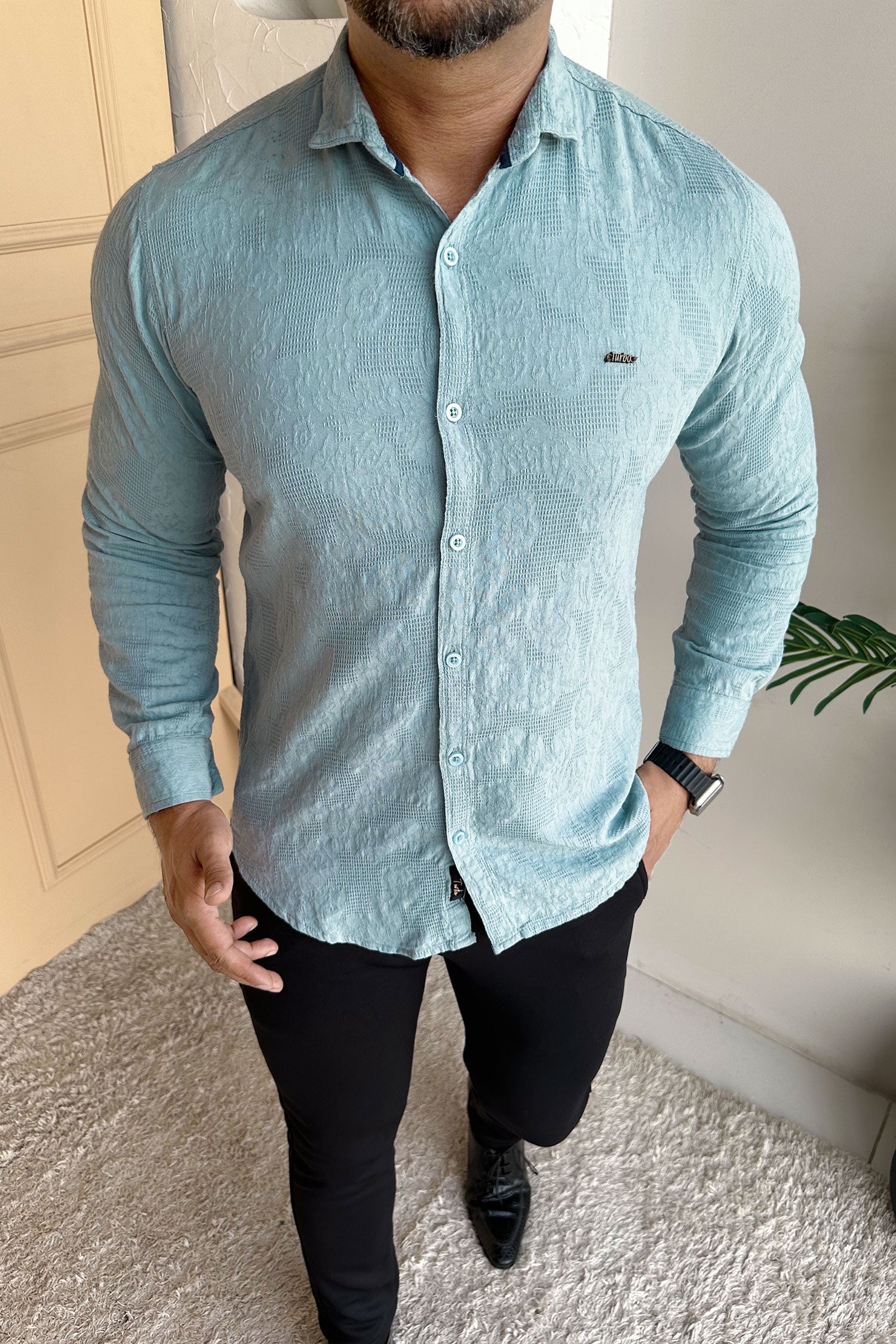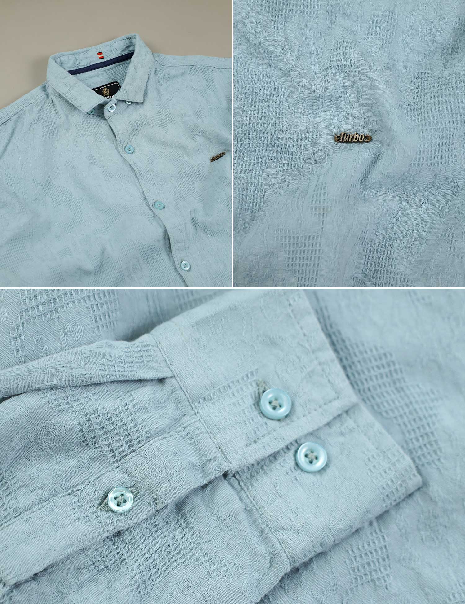 Turbo Vintage Patterend Long Sleeve Cotton Casual Shirt In Cyan