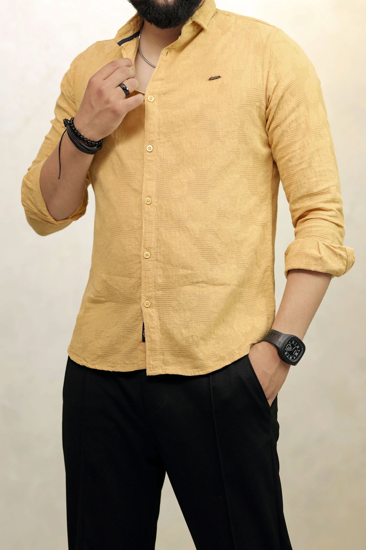 Turbo Vintage Patterend Long Sleeve Cotton Casual Shirt In Khaaki