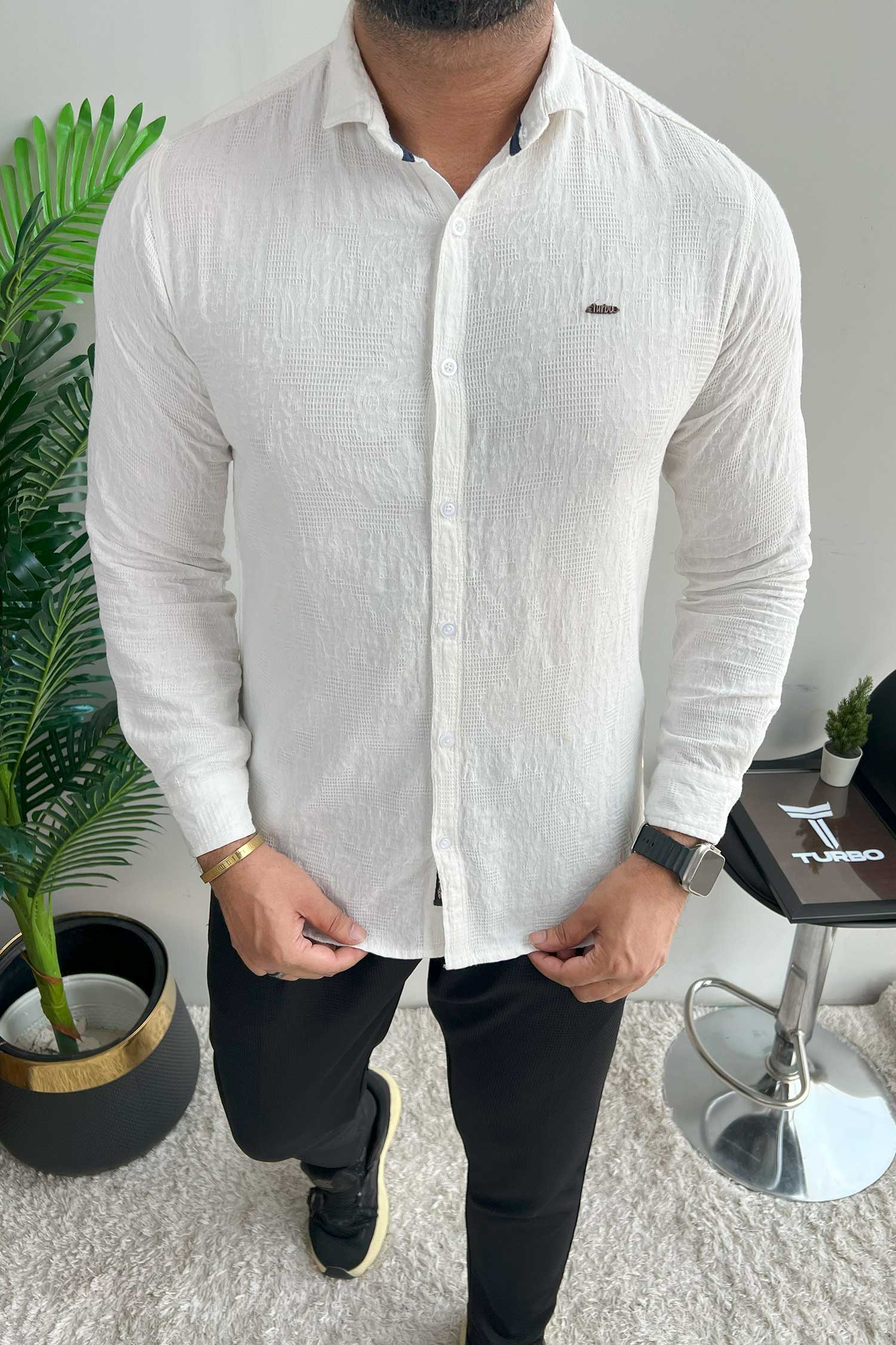 Turbo Vintage Patterend Long Sleeve Cotton Casual Shirt In White